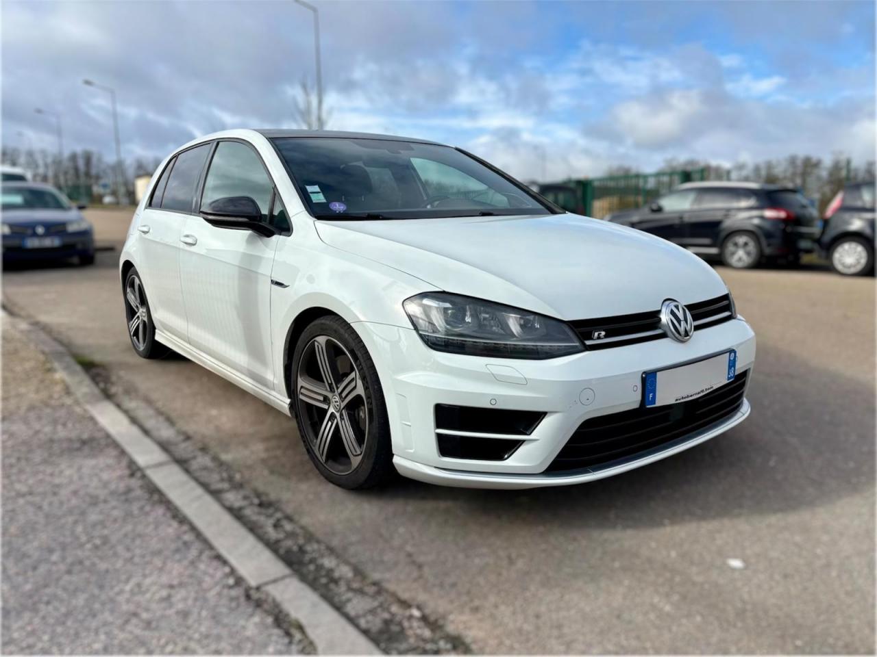 La Golf R présentée est une finition R 4Motion équipée du moteur 2.0 16V TSI BlueMotion développant 300 ch, associée à une boîte automatique DSG 6 à palettes. Carrosserie berline 5 portes, teinte extérieure Blanc Pur et intérieur noir. Mise en circulation le 03/02/2017, kilométrage affiché 113 900 km.